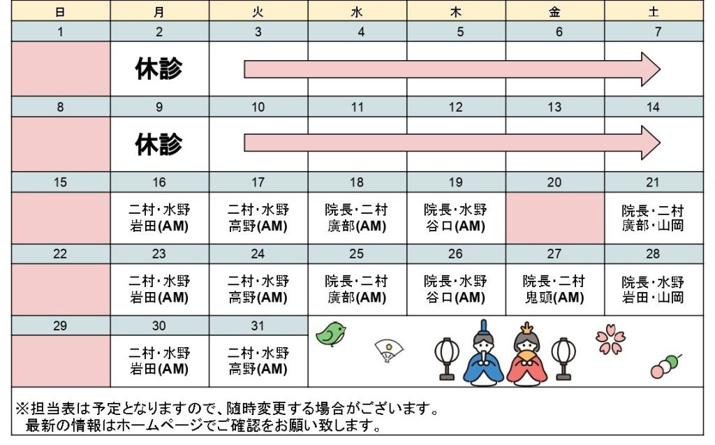 3月の担当医 変更のお知らせ